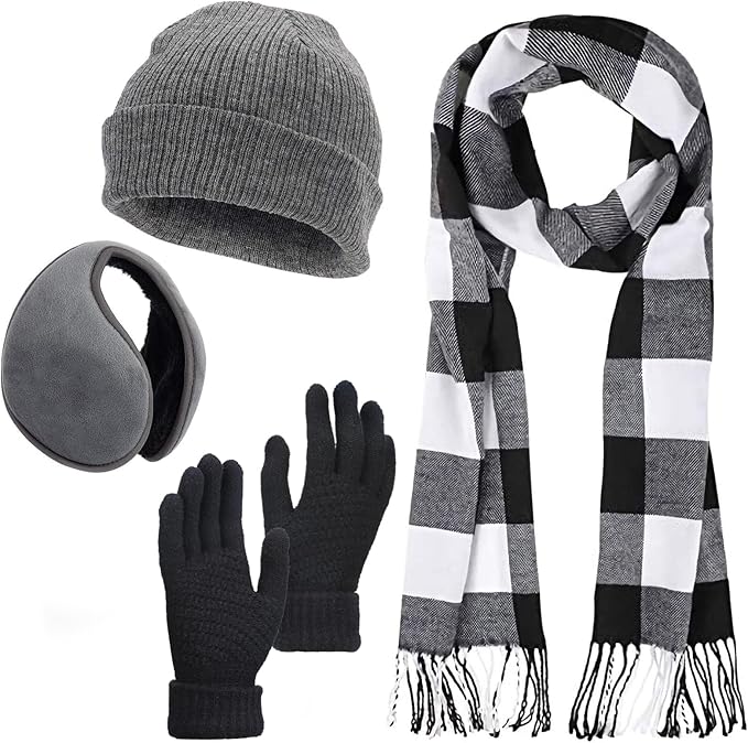 Scarf and Gloves Set - Knitted Winter Warmer Set, Winter Gloves Plaid Scarf Beanie Hat Ear Muffs for Men Women Running Skiing