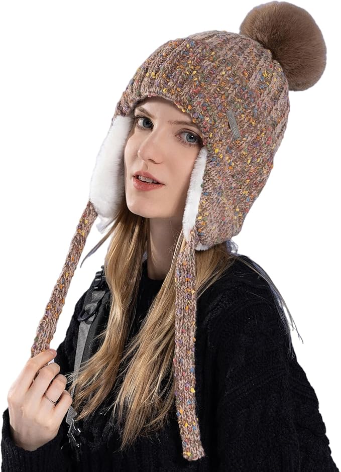 Women Winter Sherpa Beanie Hats Knit Ear Flaps Peruvian Cover Ears Fleece Lined Fluffy Ski Snow Hat Pompom