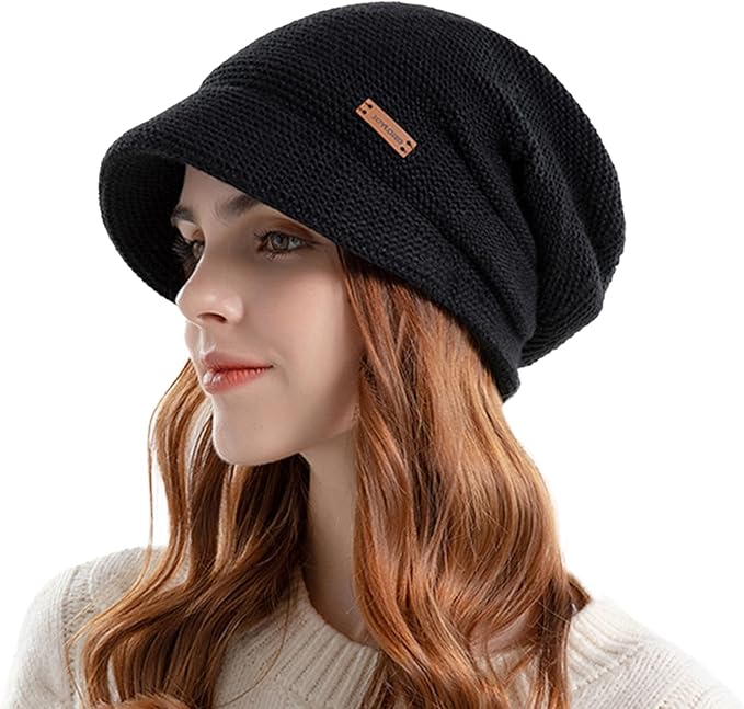Women Slouchy Knit Hat Winter Warm Fleece Lined Beanie Hat Stretchy Skull Cap with Visor Brim