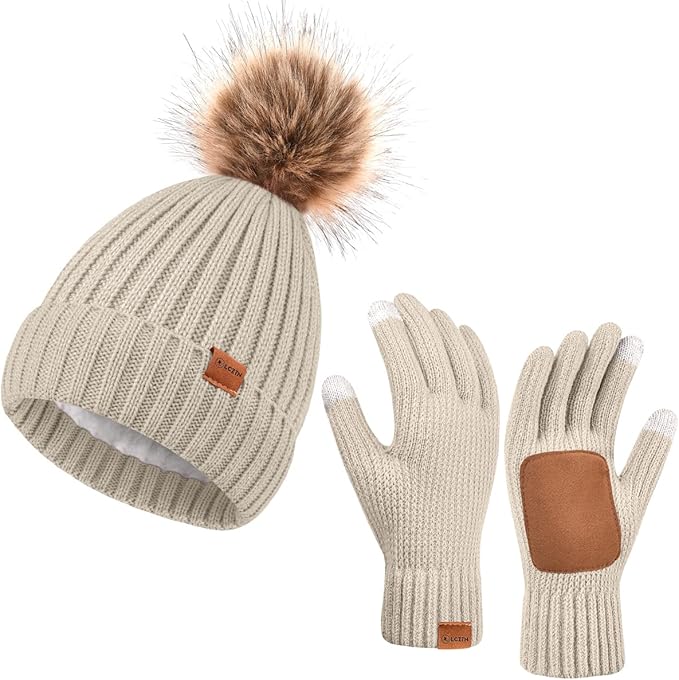 Womens Winter Beanie Hat Gloves Set,Fleece Lined Warm Knit Pom Pom Ski Hat Touchscreen Gloves Set Gifts for Cold Weather