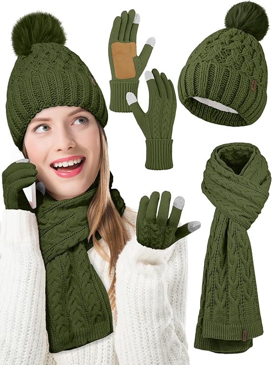 Women Winter Beanie Hat Scarf Gloves with Pom Pom Fleece Lined Touchscreen Gloves Set Thick Warm Knit Cap 3-in-1 Set